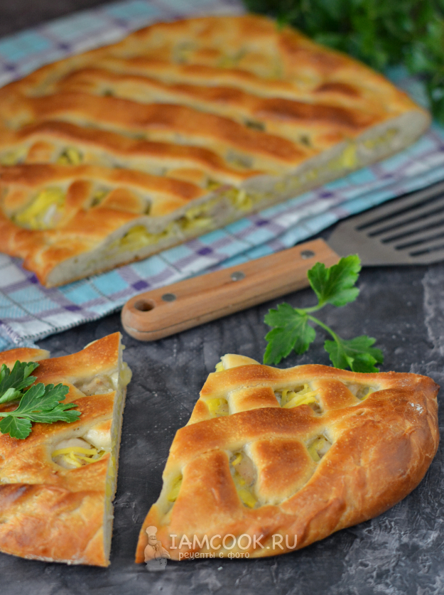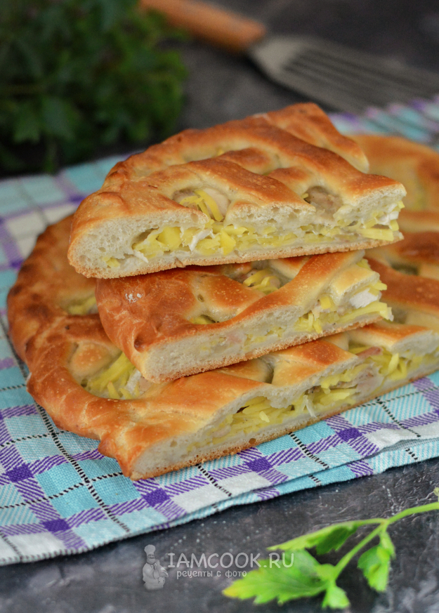 Пирог из дрожжевого теста с курицей и картошкой готов! Дайте ему немного остыть и можно угощаться!