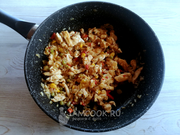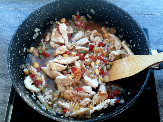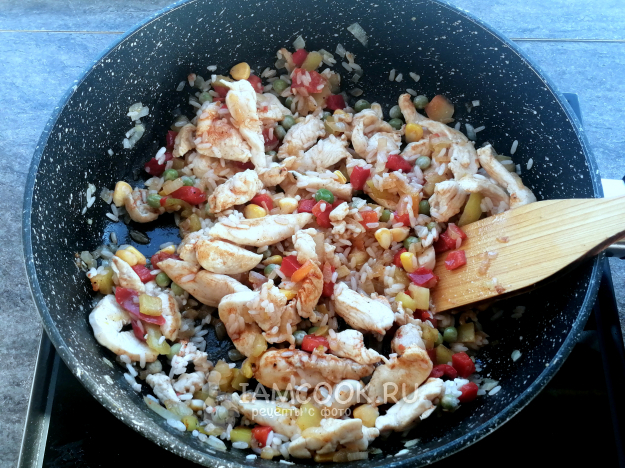Накрыть крышкой и готовить гавайскую смесь с курицей на сковороде, на среднем огне, пока вся вода не испарится. У меня ушло на это 15 минут.