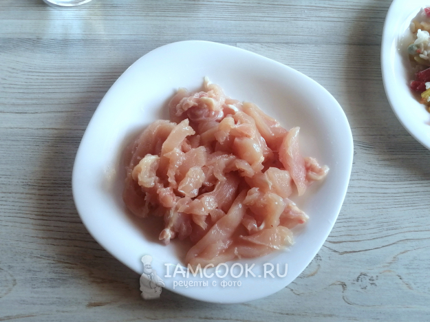 Курицу нарезать полосками или кубиком.