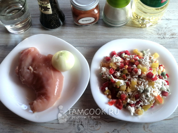 Возьмите всё необходимое, чтобы приготовить гавайскую смесь с курицей на сковороде.