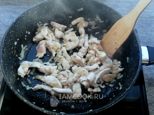 Добавить к луку курицу. Поджарить со всех сторон.