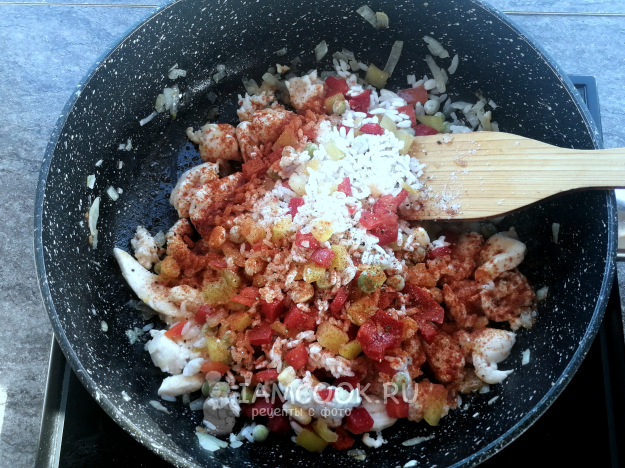 Добавить в сковороду гавайскую смесь. Посыпать паприкой, посолить и поперчить по вкусу.