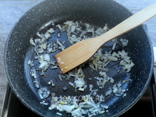 Лук нарезать кубиками. Обжарить на сковороде с маслом.