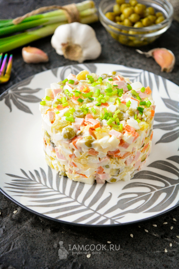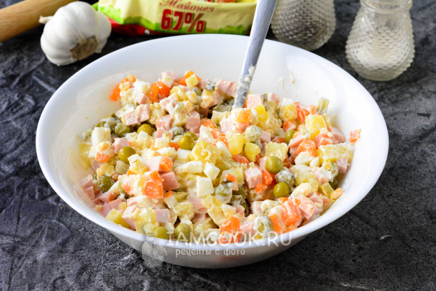 Салат перемешайте, добавьте соль и специи по вкусу. Оливье с чесноком готов. В охлажденном виде подавайте его к столу.