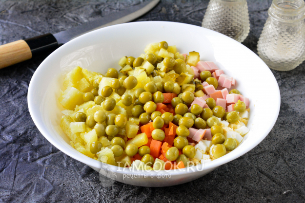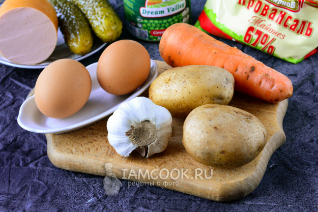 Соберите все ингредиенты для приготовления салата Оливье с чесноком.