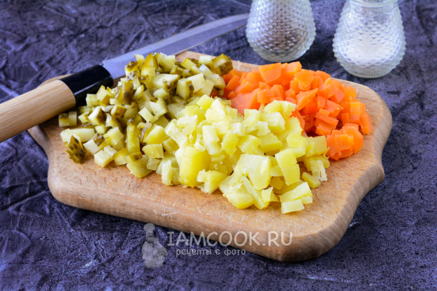 Также кубиками нарежьте отварной картофель, морковь и соленые огурцы.