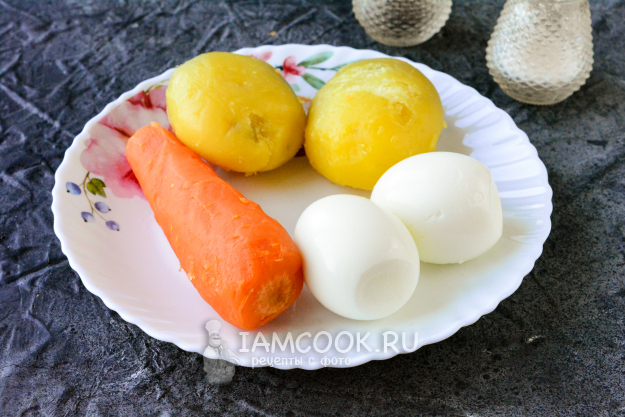 Заранее сварите все корнеплоды и яйца. Картофель и морковь варите около 25 минут, до мягкости. Куриные яйца сварите вкрутую - 8-9 минут в кипящей воде. Все ингредиенты почистите для салата.