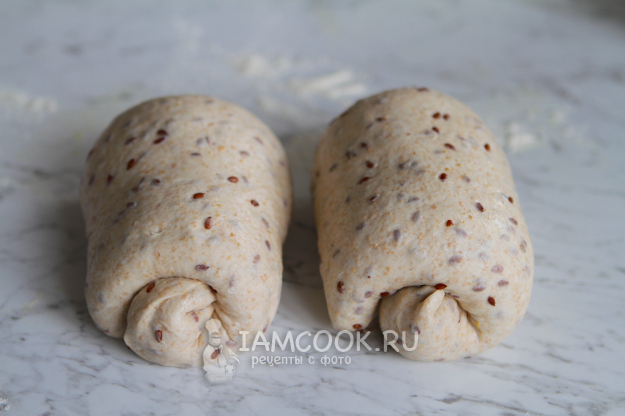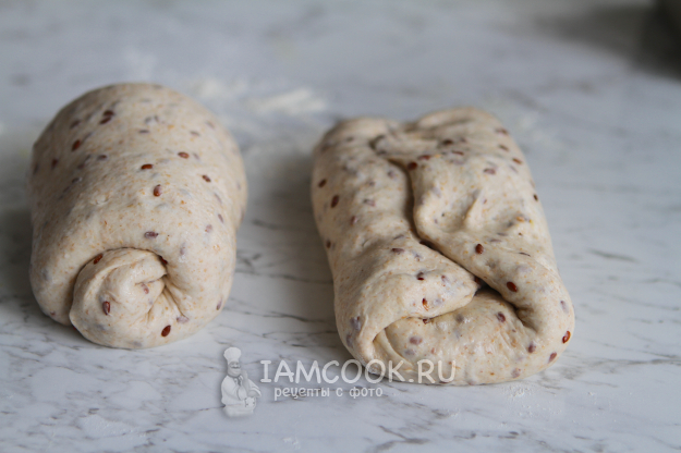 Оставить на столе на 10 минут, затем сформировать хлеб. Я делала это следующим образом... Заготовку перевернуть швом вверх, растянуть. Сложить в виде книжки, затем свернуть.
