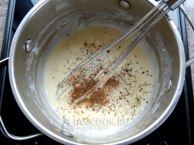 В конце посолить и поперчить соус по вкусу, добавить мускатный орех.