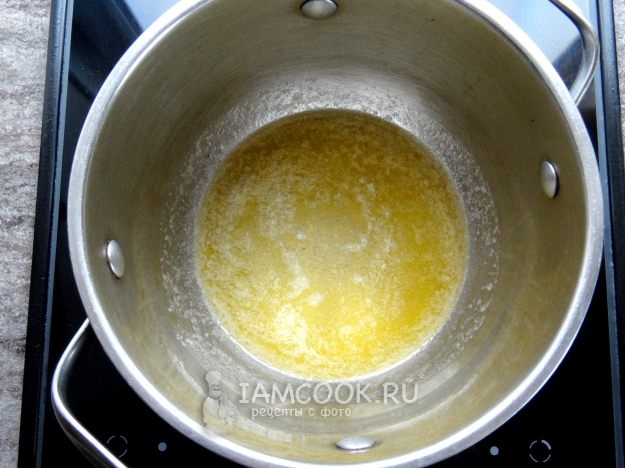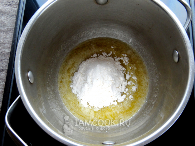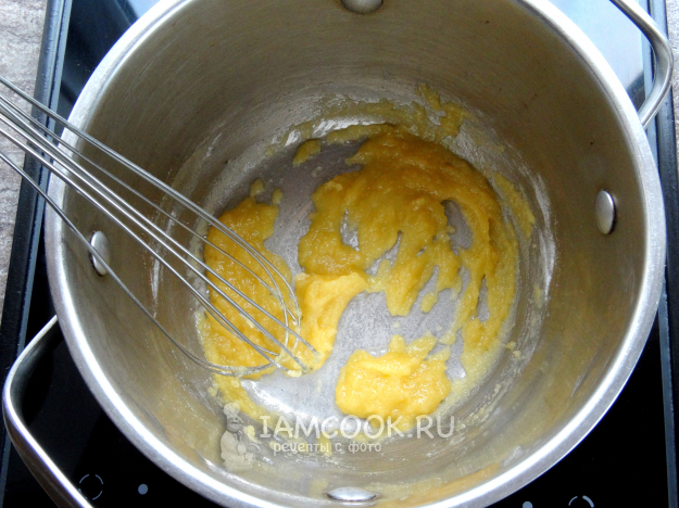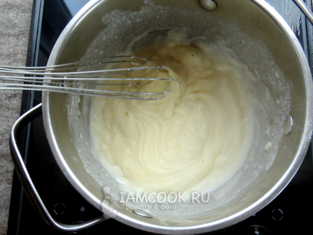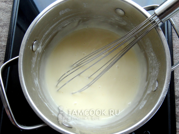 Тонкой струйкой влить в кастрюлю горячее молоко, постоянно мешая.