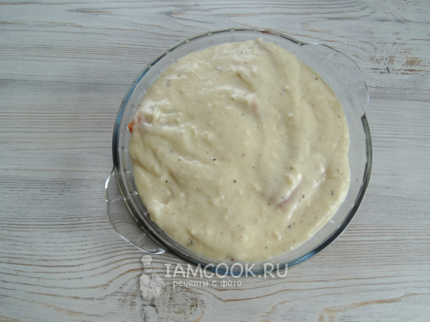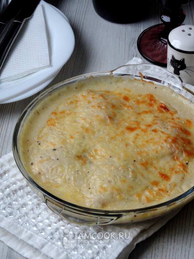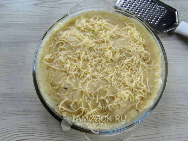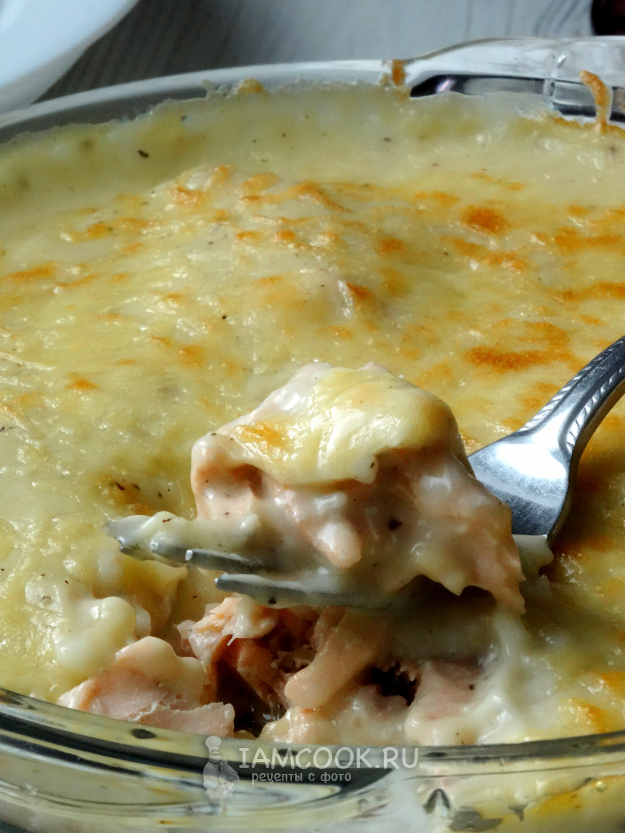 Затем посыпать сыром и запечь горбушу под соусом бешамель в духовке ещё в течение 5 минут.