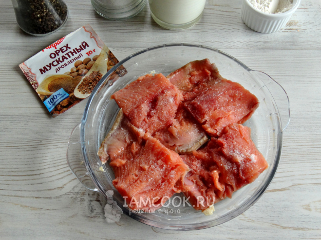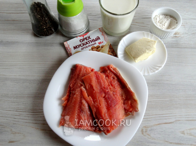 Возьмите необходимые ингредиенты, чтобы приготовить горбушу под соусом бешамель в духовке.