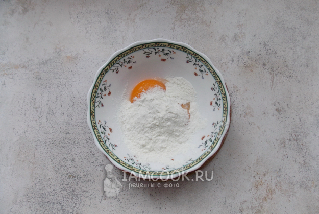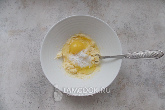 Добавьте желток, разрыхлитель и соль.