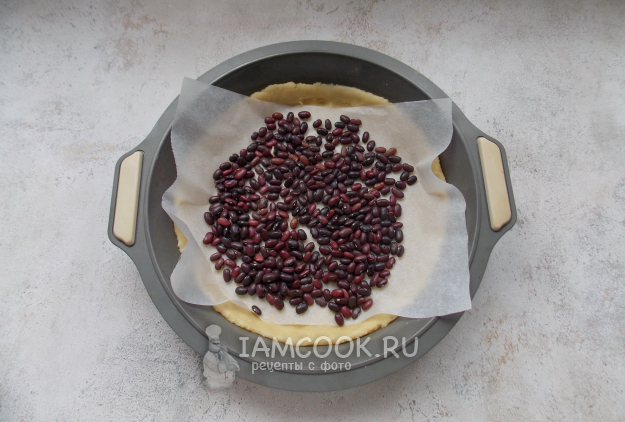 Затем накройте тесто пекарской бумагой и выложите груз в виде фасоли или гороха.