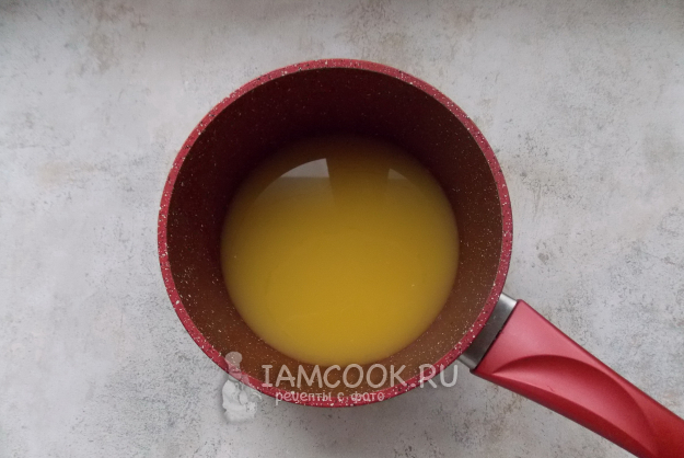 Тем временем займитесь кремом. В кастрюлю с толстым дном налейте апельсиновый сок.