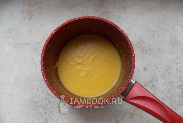 Приготовленную смесь налейте в кастрюлю с апельсиновым соком и хорошо перемешайте. На среднем огне, постоянно перемешивая, доведите крем до загустения.