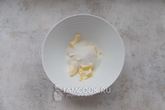 Замесите тесто. В миску выложите мягкое сливочное масло и насыпьте сахар.