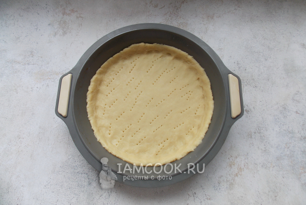 Охлажденное тесто раскатайте и выложите в форму для запекания, образуя бортики. Наколите вилкой.