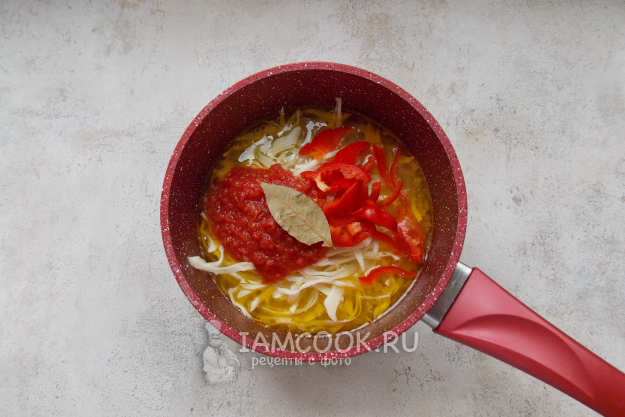 Добавьте томатный морс, который можно заменить измельченными помидорами или томатным соком. Подойдет также и томатная паста, но с морсом или помидорами вкуснее, на мой взгляд. Посолите, поперчите, приправьте лавровым листом.