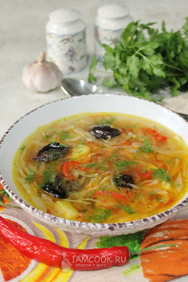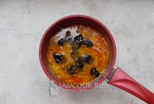 Варите щи до готовности всех ингредиентов. За 5 минут до окончания приготовления выложите чернослив, который предварительно тщательно помойте.