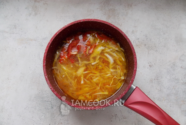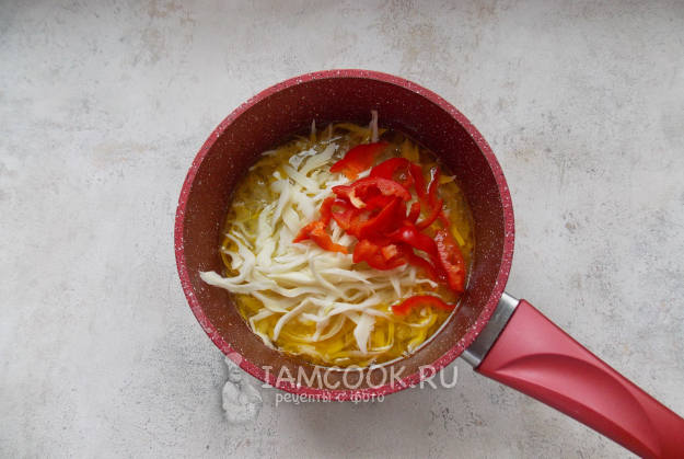 Затем добавьте капусту и болгарский перец, нарезанные соломкой.