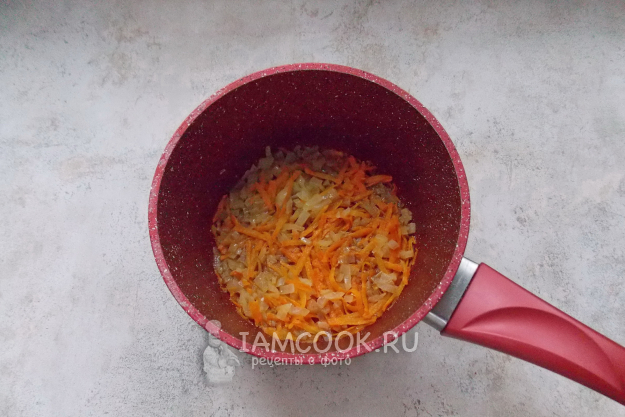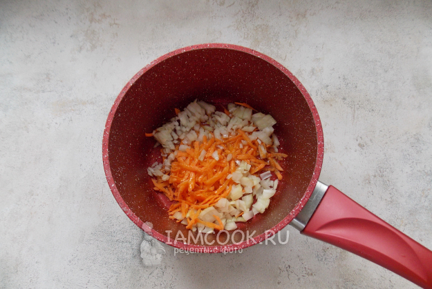 Лук мелко нарежьте, а морковь натрите на терке. Выложите в кастрюлю с толстым дном или сковороду. Налейте растительное масло.