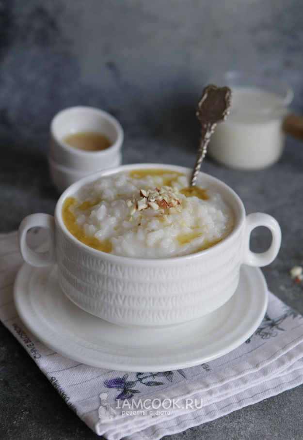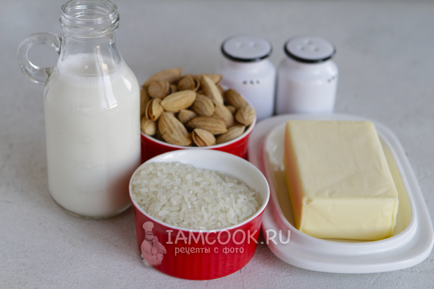 Перед вами все продукты, которые необходимы для приготовления рисовой каши на миндальном молоке.