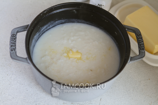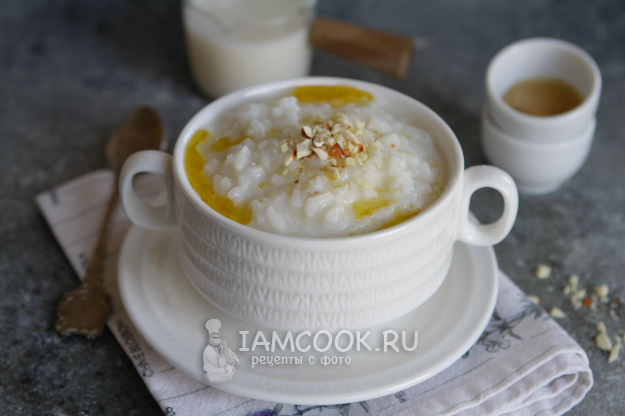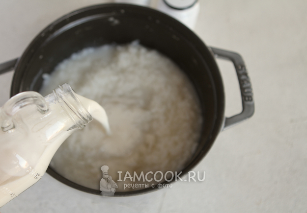 Как только рис будет готов, влить миндальное молоко. Я добавляла 200 мл. Добавляем соль, сахар по вкусу. Варить кашу на медленном огне, регулярно помешивая, еще примерно 10-15 минут, до желаемой густоты. Готовая каша должна быть вязкой. Чем дольше каша настаивается, тем гуще она получается.
