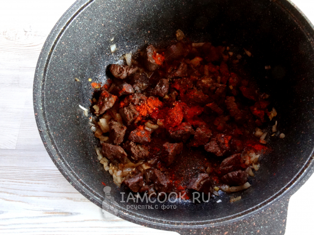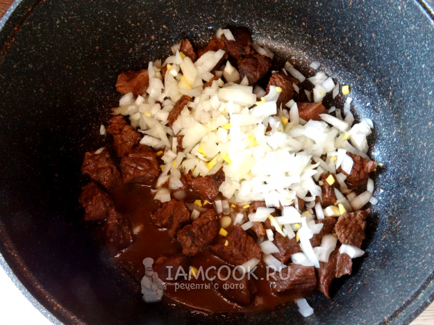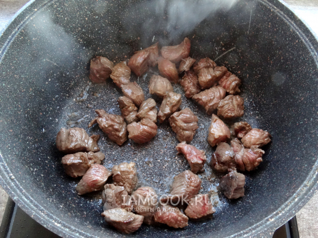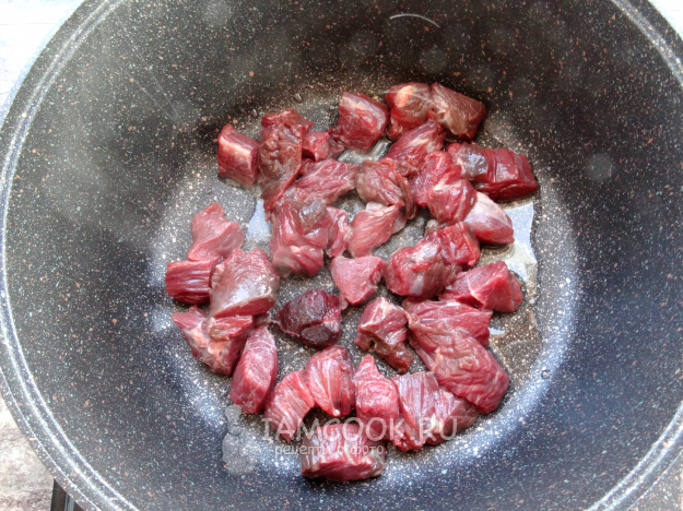 В сковороде/казане/кастрюле накалить масло. Выложить мясо.