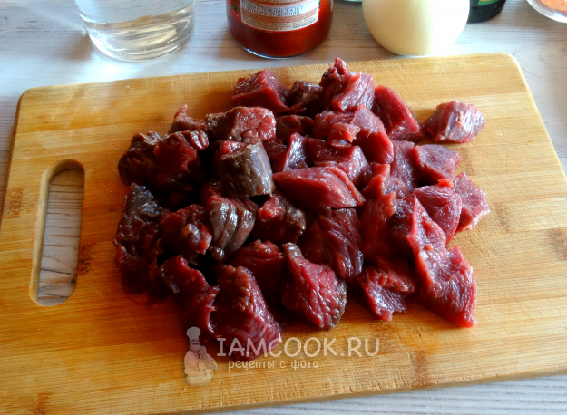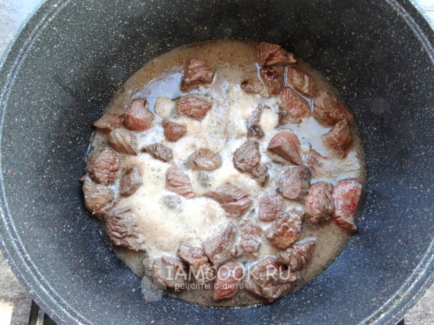 Залить мясо водой и тушить под крышкой до мягкости мяса и испарения воды.
