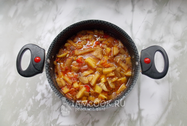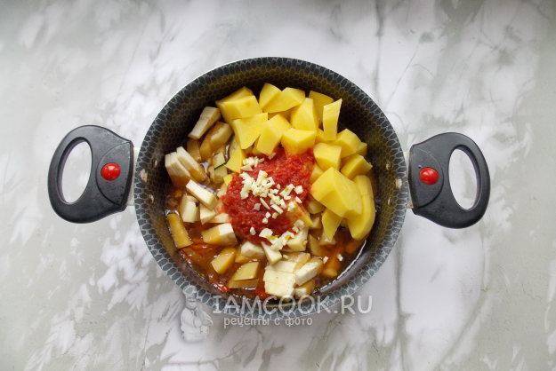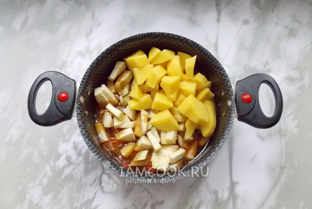 Накройте кастрюлю крышкой и тушите мясо с овощами 20-25 минут. После картофель и баклажан очистите, помойте и нарежьте кубиками. Выложите в кастрюлю.