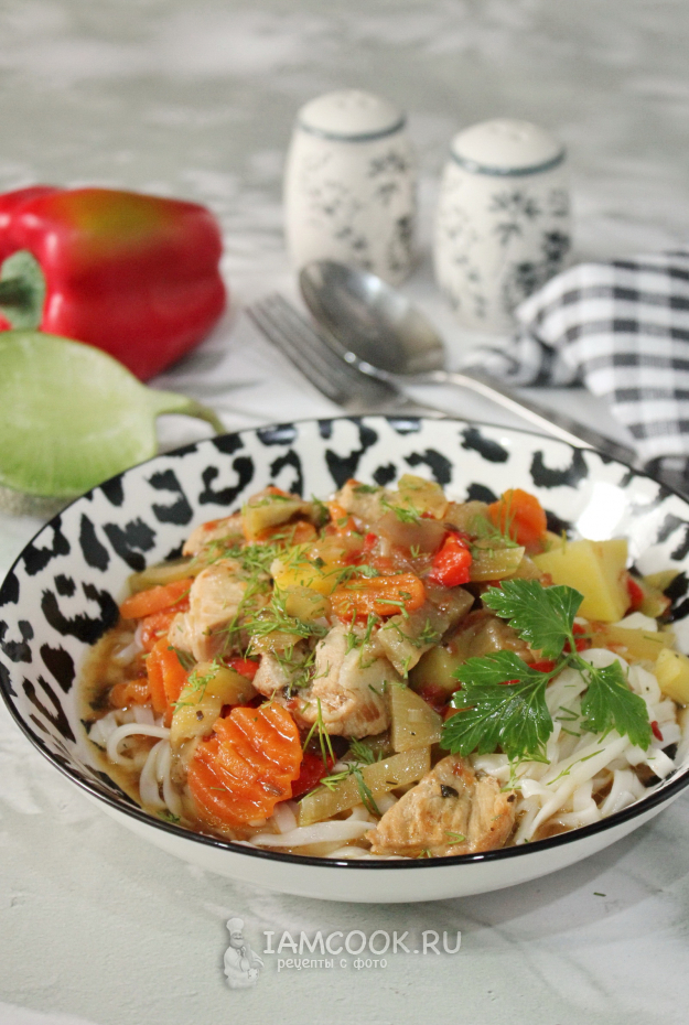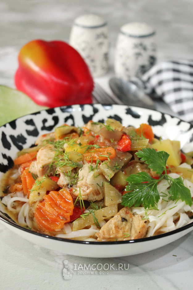 При подаче в тарелку выложите лапшу.