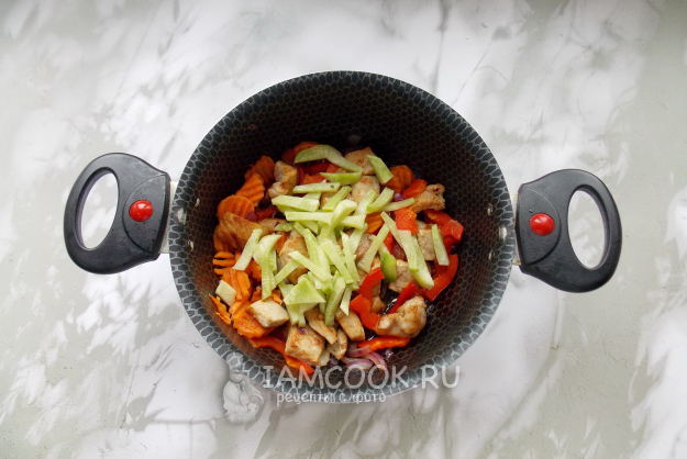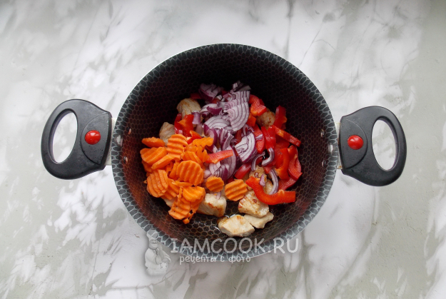 Морковь, красный лук и болгарский перец очистите, помойте и нарежьте произвольно. Добавьте в кастрюлю со свининой.