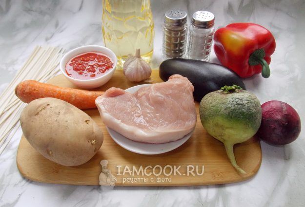Соберите ингредиенты для приготовления лагмана со свининой и картошкой.