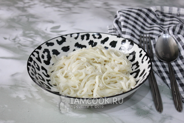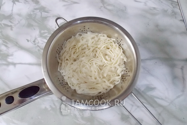 Лапшу отварите в подсоленной воде, согласно инструкции на упаковке. После откиньте на дуршлаг.