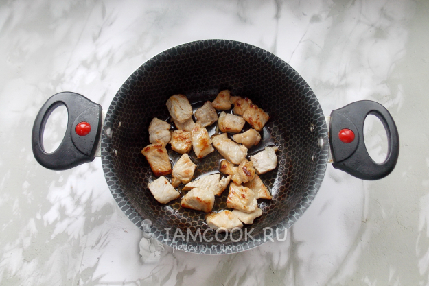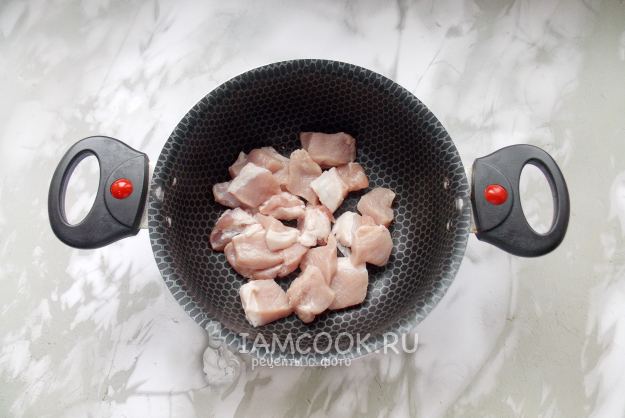Свинину нарежьте небольшими кусочками и выложите в кастрюлю с подсолнечным маслом.