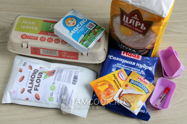 Для печенья «Финансье» подготовьте ингредиенты по списку к рецепту. Соотношение пшеничной и миндальной муки может варьироваться относительно друг друга. Для усиления вкуса берите экстракты или ароматизаторы со вкусом миндаля и амаретто.