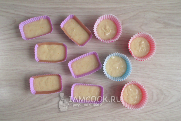 Разложите порции теста по формочкам на половину или на две трети высоты. Кроме прямоугольных, берите круглые или другие формочки. Попадалась инфа, что возникают сложности при извлечении готового печенья из форм, поэтому некоторые проложила бумажными вкладышами. В итоге поняла, что это и не обязательно.