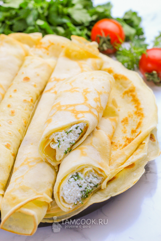 Выложите готовые блины с творожным сыром и зеленью на тарелку и подайте к столу. При подаче на праздничный стол их нужно охладить и нарезать на части.