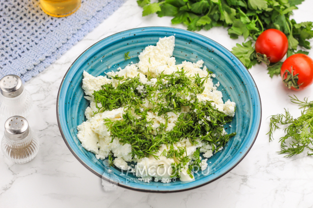 Промойте укроп и измельчите. Перемешайте его с творожным сыром и солью, создавая начинку.