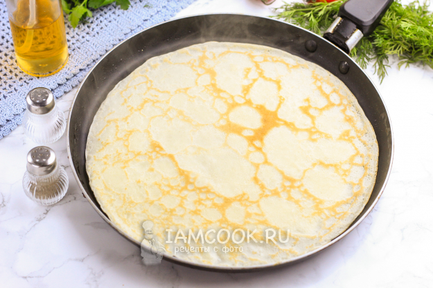 Прогрейте сковороду на плите, затем нагрев уменьшите до среднего. Смажьте в первый раз дно сковороды растительным маслом и влейте тесто, используя половник. Теста понадобится немного, главное - сразу же округляйте его на сковороде, чтобы оно описало круг. Прожарьте блин с одной стороны 1 минуту, затем переверните и допеките такое же количество времени. Выложите блин на тарелку и снова налейте порцию теста. Таким образом обжарьте все блины.