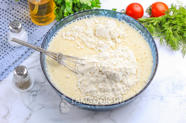 Добавьте по частям пшеничную муку, вмешивая ее в жидкую основу, но не взбивая. Если будете взбивать, то образуются комочки в тесте. Когда тесто будет замешано, влейте в него растительное масло, оставляя немного для смазывания сковороды. Обязательно дайте тесту «отдохнуть» 15-20 минут - клейковина активизируется и тесто станет более пластичным, блины не будут рваться при переворачивании.