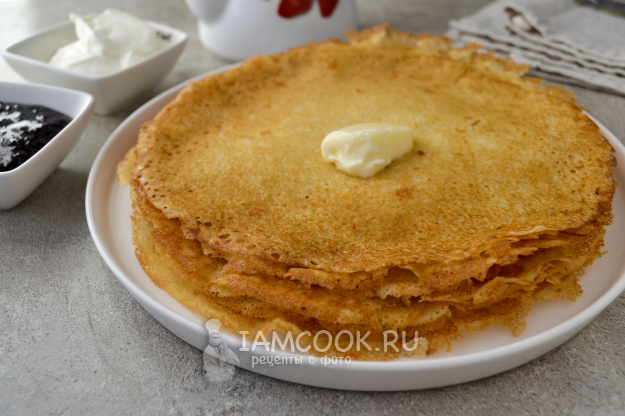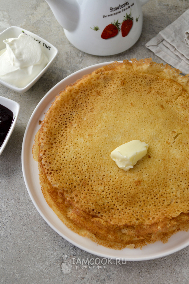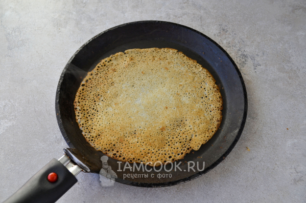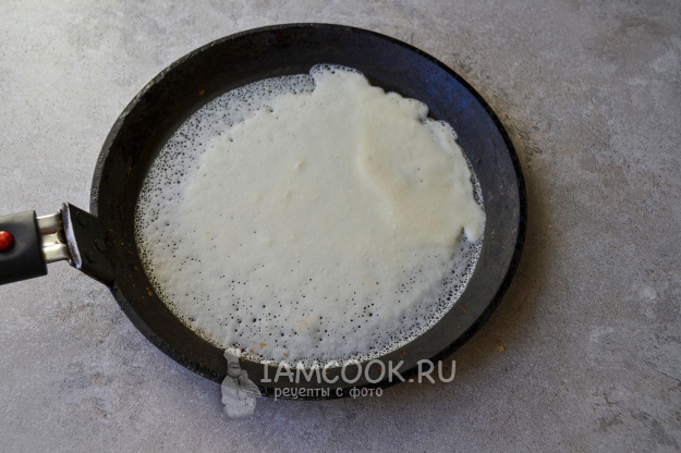 Раскалите сковороду. Перед выпечкой первого блина смажьте сковороду растительным маслом и вылейте тесто тонким слоем.