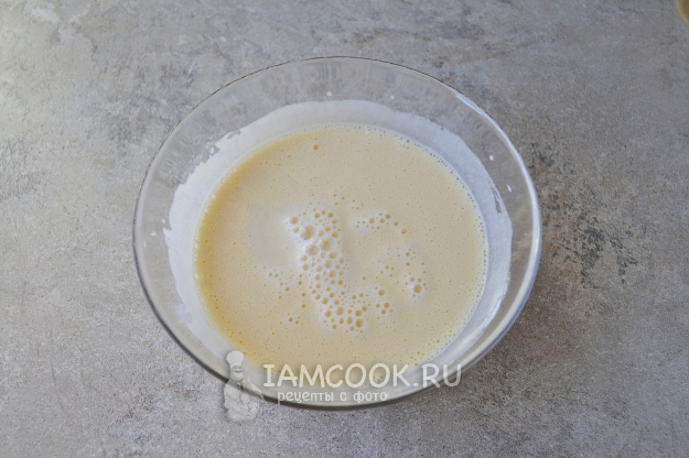 Венчиком взбейте ряженку с яйцом до однородной консистенции. Насыпьте в миску муку.