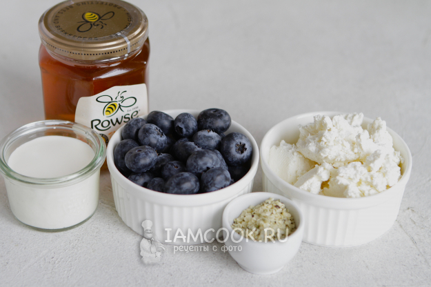 Соберите все продукты для приготовления завтрака из творога с голубикой. Это одно из моих любимых сочетаний. В принципе, голубику можно заменить на любую другую ягоду: малину, чернику, клубнику. В идеале, конечно, добавлять свежие ягоды, не замороженные.