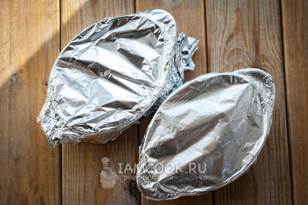 Форму (формы) затянем пищевой фольгой и отправим в уже разогретую до 180 градусов духовку запекаться в течение 25 минут.