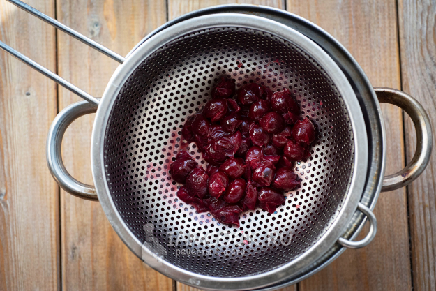 Откинем содержимое сотейника на дуршлаг, ягоды протрем толкушкой для картофеля.