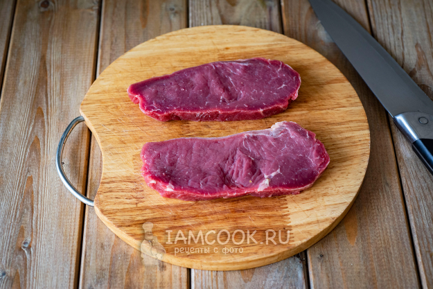 Отрежем от общего куска говядины два стейка толщиной примерно в 1 см и весом примерно по 120 грамм.