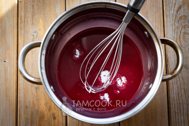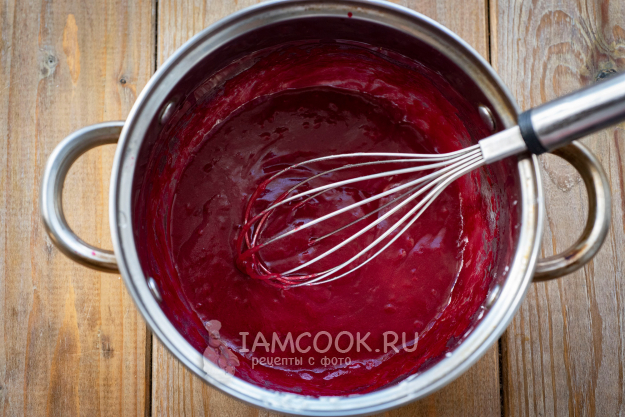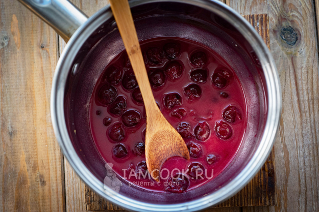 К вишневой массе добавим 1/2 ч.л. крахмала, хорошенько размешаем и поставим на небольшой огонь, постоянно помешиваем венчиком, варим до закипания. Крахмал добавляем очень аккуратно, чтобы на выходе не получить очень густую массу, непохожую на соус.