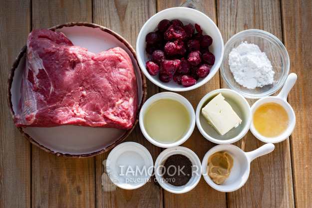 Сразу же соберём все ингредиенты для приготовления говядины в вишневом соусе. Ягоды вишни размораживать заранее не надо.